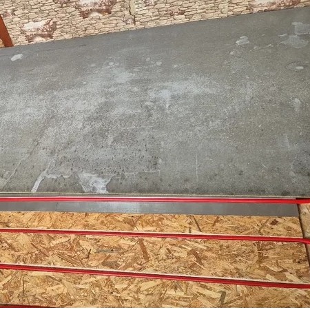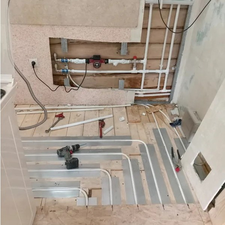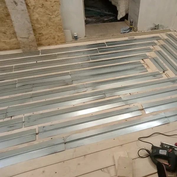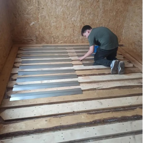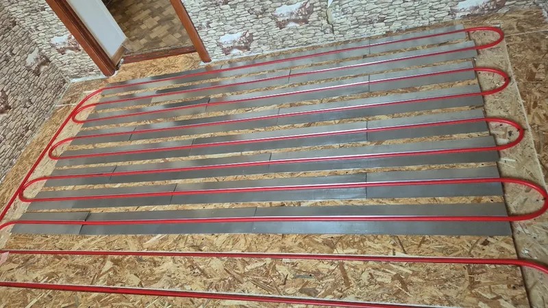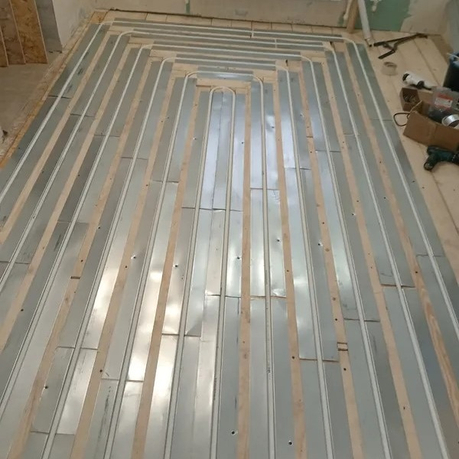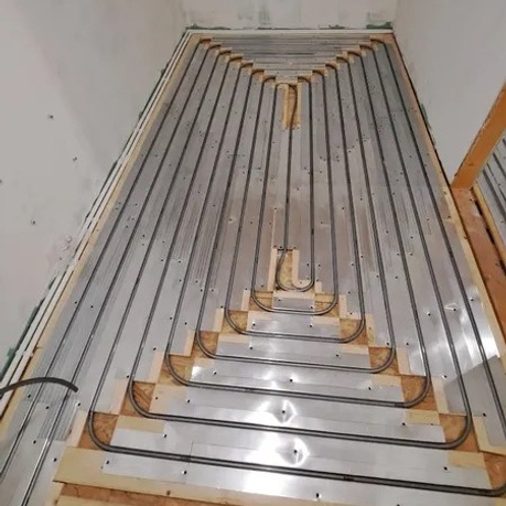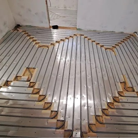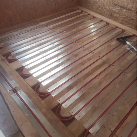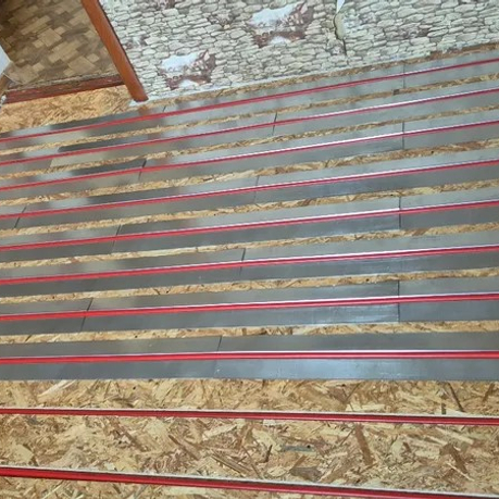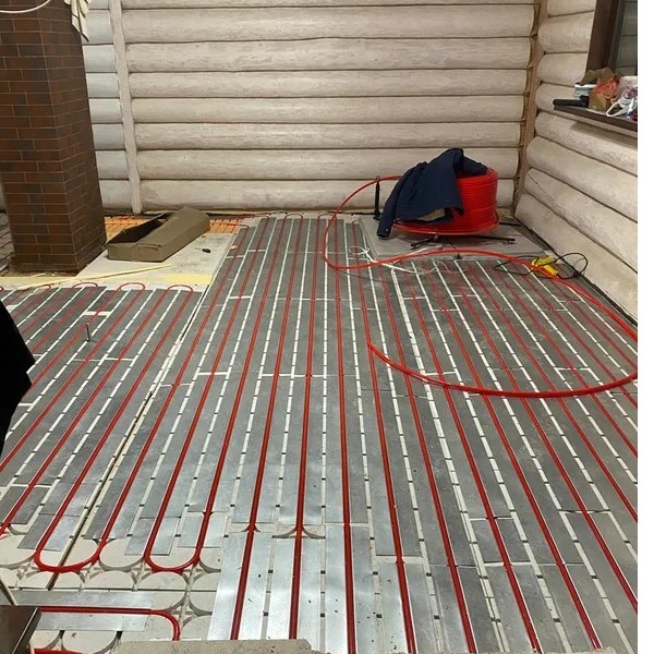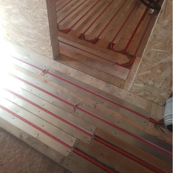 Для организации систем теплого пола в в деревянных и каркасных домах используют теплораспределительные пластины из оцинкованной стали. Труба из сшитого полиэтилена 16x2.0 укладывается в специальный паз, который плотно охватывает практически всю её поверхность распределяя 95% теплового потока. Это обеспечивает максимальную передачу тепла. В качестве напольного покрытия рекомендуется использовать плиты с высокой теплопроводностью, например ЦСП или ГВЛ. Тепловая мощность такой системы 50-200 Вт/м2, в зависимости от типа напольного покрытия и способа укладки трубы (минимальный шаг укладки 100 мм).