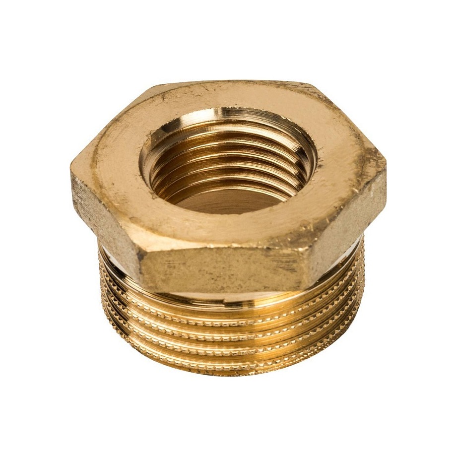 Латунный резьбовой фитинг представляет собой гайку или втулку, имеющую наружную резьбу для соединения большего диаметра и внутреннюю резьбу для соединения меньшего диаметра. Основное назначение — обеспечить переход от одного диаметра резьбы к другому.