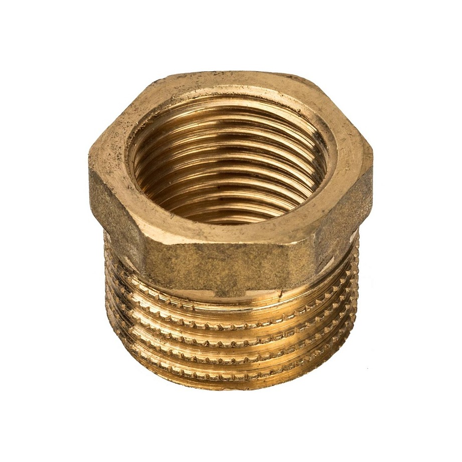 Латунный резьбовой фитинг представляет собой гайку или втулку, имеющую наружную резьбу для соединения большего диаметра и внутреннюю резьбу для соединения меньшего диаметра. Основное назначение — обеспечить переход от одного диаметра резьбы к другому.