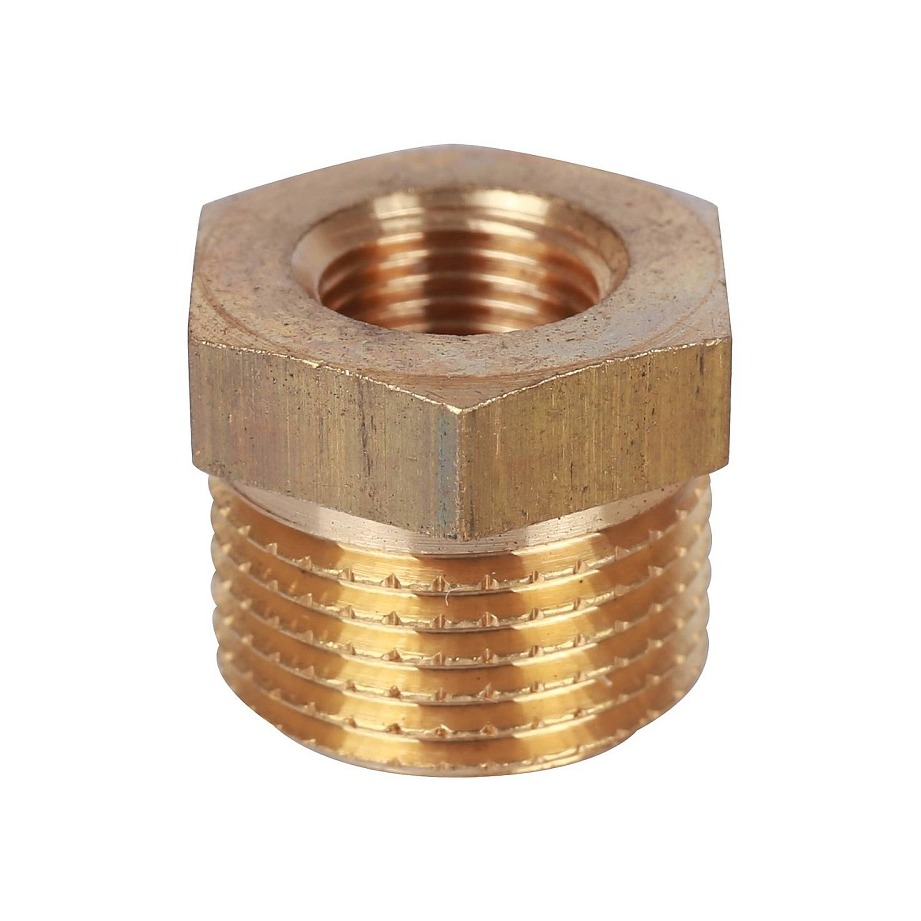 Латунный резьбовой фитинг представляет собой гайку или втулку, имеющую наружную резьбу для соединения большего диаметра и внутреннюю резьбу для соединения меньшего диаметра. Основное назначение — обеспечить переход от одного диаметра резьбы к другому.
