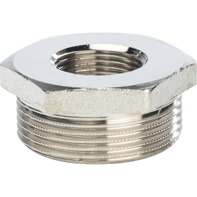 Латунный резьбовой фитинг представляет собой гайку или втулку, имеющую наружную резьбу для соединения большего диаметра и внутреннюю резьбу для соединения меньшего диаметра. Основное назначение — обеспечить переход от одного диаметра резьбы к другому.