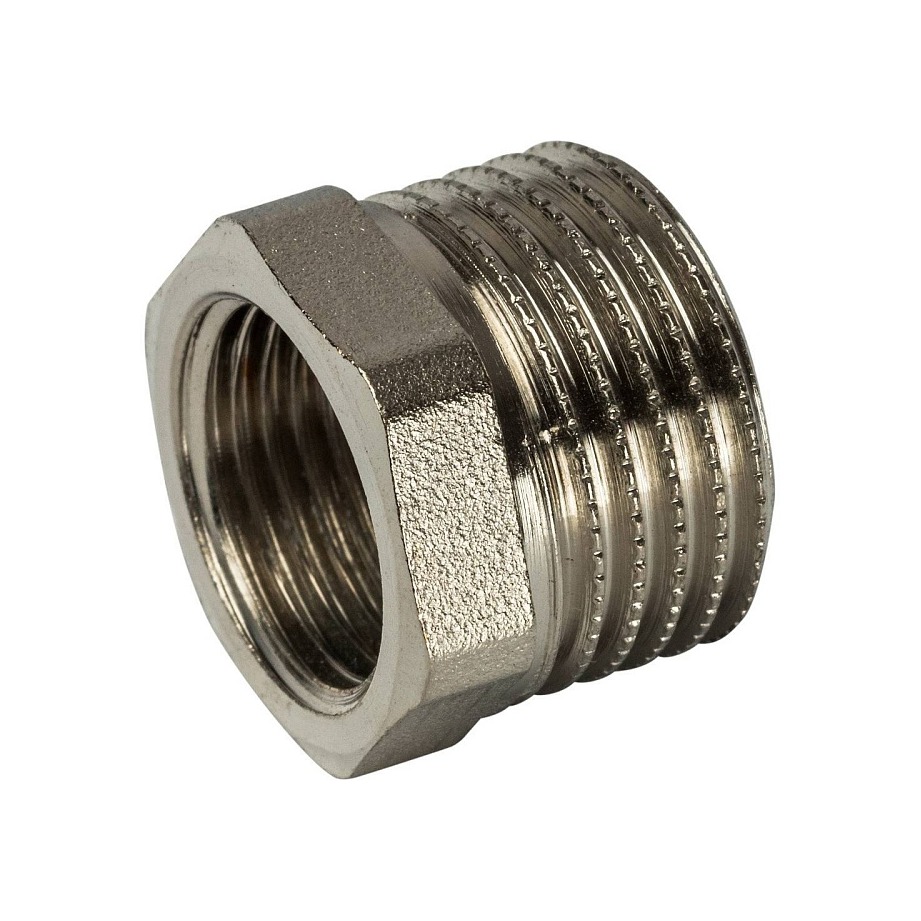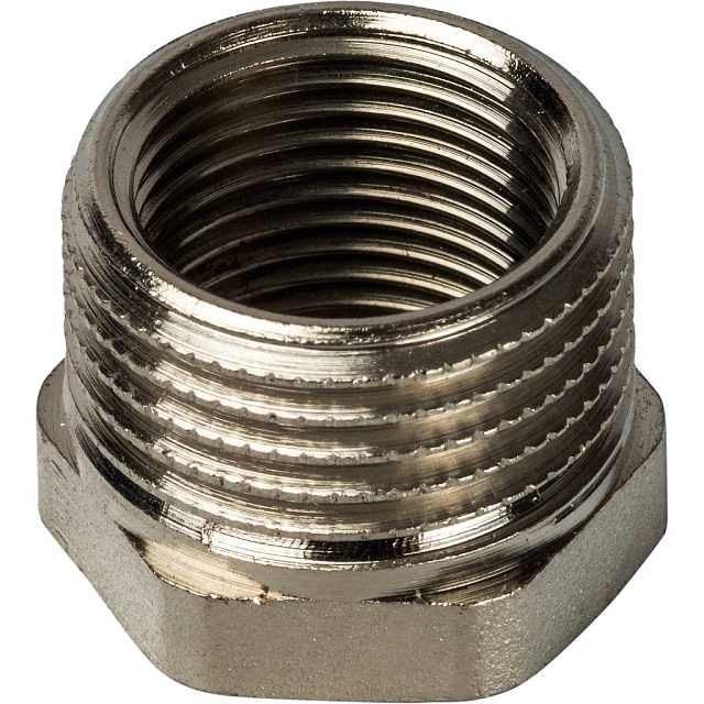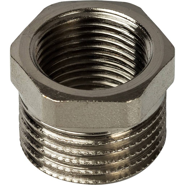 Латунный резьбовой фитинг представляет собой гайку или втулку, имеющую наружную резьбу для соединения большего диаметра и внутреннюю резьбу для соединения меньшего диаметра. Основное назначение — обеспечить переход от одного диаметра резьбы к другому.