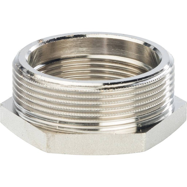 Латунный резьбовой фитинг представляет собой гайку или втулку, имеющую наружную резьбу для соединения большего диаметра и внутреннюю резьбу для соединения меньшего диаметра. Основное назначение — обеспечить переход от одного диаметра резьбы к другому.