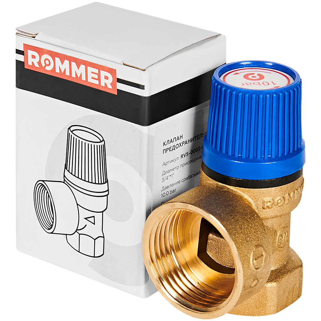 Клапан предохранительный ROMMER - 3/4", сброс 1" (ВР/ВР, Tmax 110°C, 10 бар)