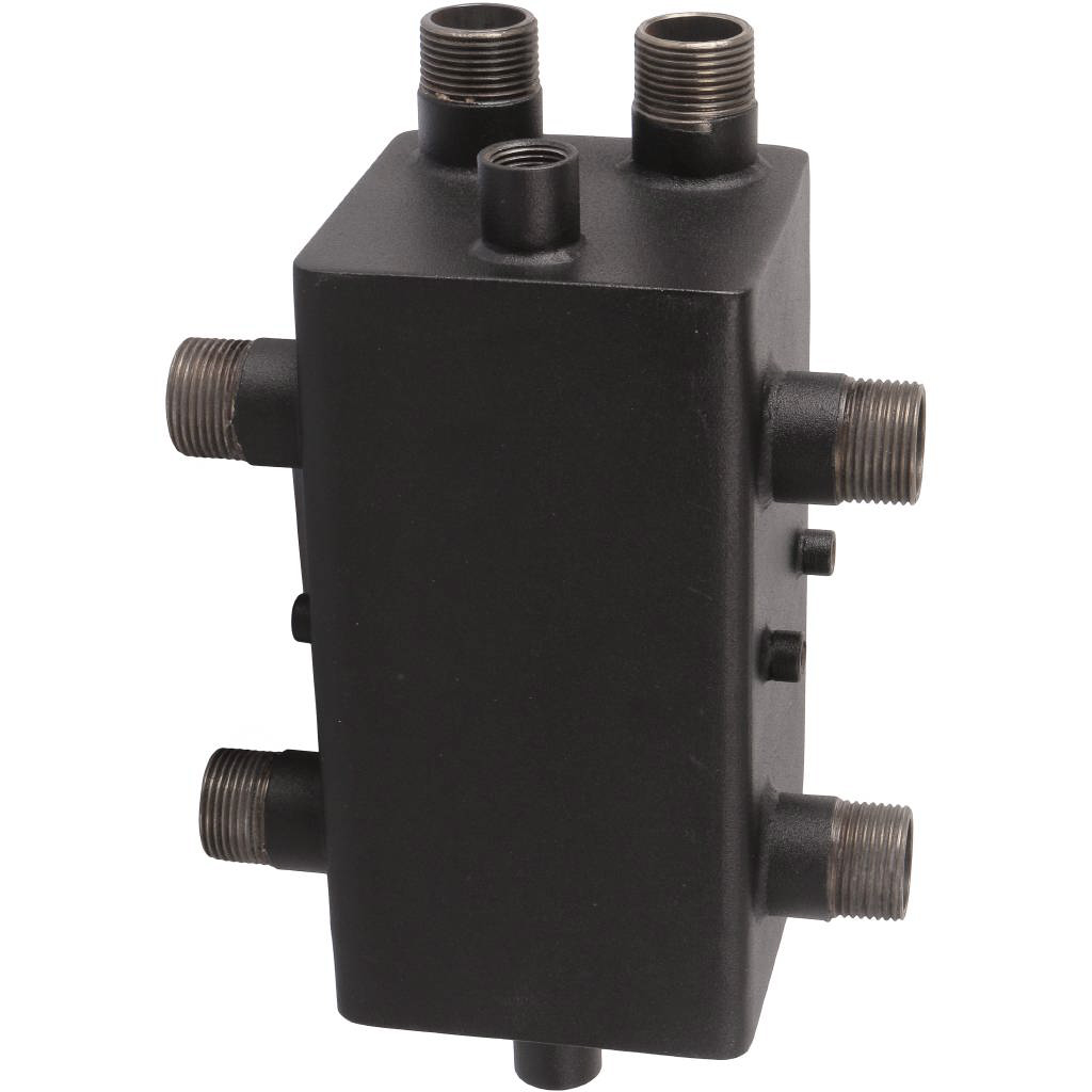 Коллектор с гидравлическим разделителем для настенных котлов является теплораспределяющей гребенкой. Внутренняя полость разделена перемычкой на две равные части. С помощью встроенного гидравлического разделителя обеспечивается разница расходов в контурах. Сверху подключается подача горячей воды и обратная линия от котла. Размер подключения 1" (наружная резьба). Справа и слева подключение двух контуров. Подключение 1" (наружная резьба).