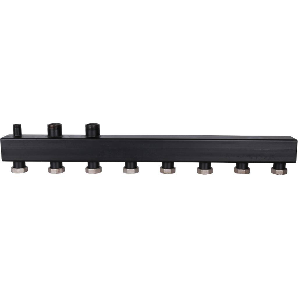 Настенный распределительный однокорпусный коллектор из черной стали с разделением подающей и обратной линий, с накидными гайками.