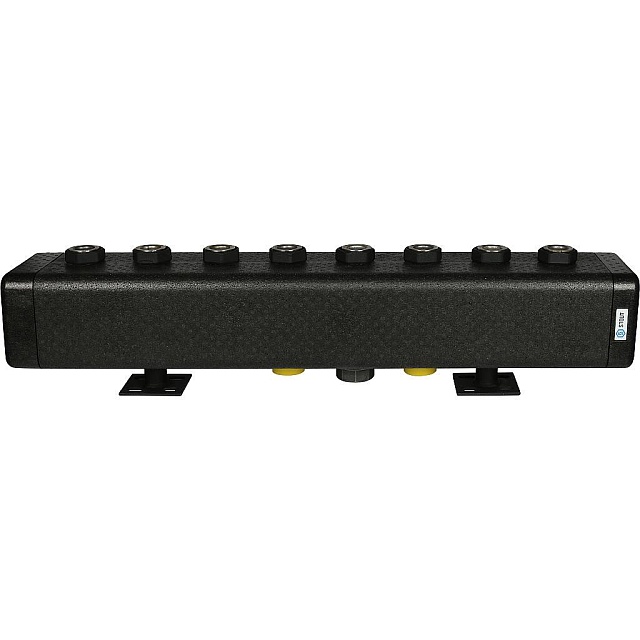 Верхние патрубки коллектора оснащены накидными гайками для обеспечения быстрого монтажа насосных узлов и элементов гидромодуля, а нижние имеют наружную резьбу. Благодаря защите коллекторов изоляционным материалом, значительно снижаются тепловые потери, снижаются риски получения ожогов при обслуживании системы. Надежность крепления коллектора к несущим элементам зданий, обеспечивается при помощи кронштейнов, входящих в комплект поставки.