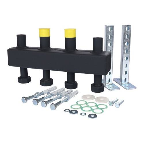 Верхние патрубки коллектора оснащены накидными гайками для обеспечения быстрого монтажа насосных узлов и элементов гидромодуля, а нижние имеют наружную резьбу. Благодаря защите коллекторов изоляционным материалом, значительно снижаются тепловые потери, снижаются риски получения ожогов при обслуживании системы. Надежность крепления коллектора к несущим элементам зданий, обеспечивается при помощи кронштейнов, входящих в комплект поставки.