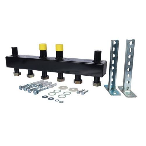 Верхние патрубки коллектора оснащены накидными гайками для обеспечения быстрого монтажа насосных узлов и элементов гидромодуля, а нижние имеют наружную резьбу. Благодаря защите коллекторов изоляционным материалом, значительно снижаются тепловые потери, снижаются риски получения ожогов при обслуживании системы. Надежность крепления коллектора к несущим элементам зданий, обеспечивается при помощи кронштейнов, входящих в комплект поставки.