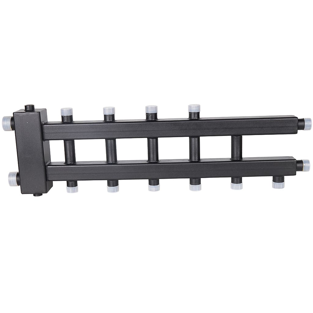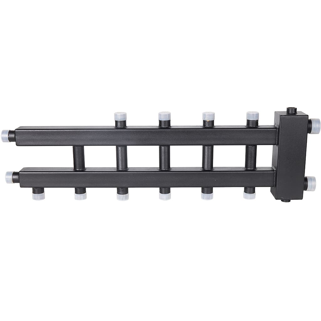 Настенный коллектор отопления с гидроразделителем с разделением подающей и обратной линий в компактном исполнении.