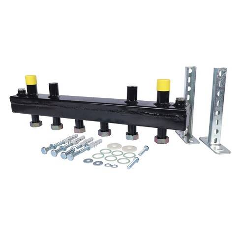 Верхние патрубки коллектора оснащены накидными гайками для обеспечения быстрого монтажа насосных узлов и элементов гидромодуля, а нижние имеют наружную резьбу. Благодаря защите коллекторов изоляционным материалом, значительно снижаются тепловые потери, снижаются риски получения ожогов при обслуживании системы. Надежность крепления коллектора к несущим элементам зданий, обеспечивается при помощи кронштейнов, входящих в комплект поставки.