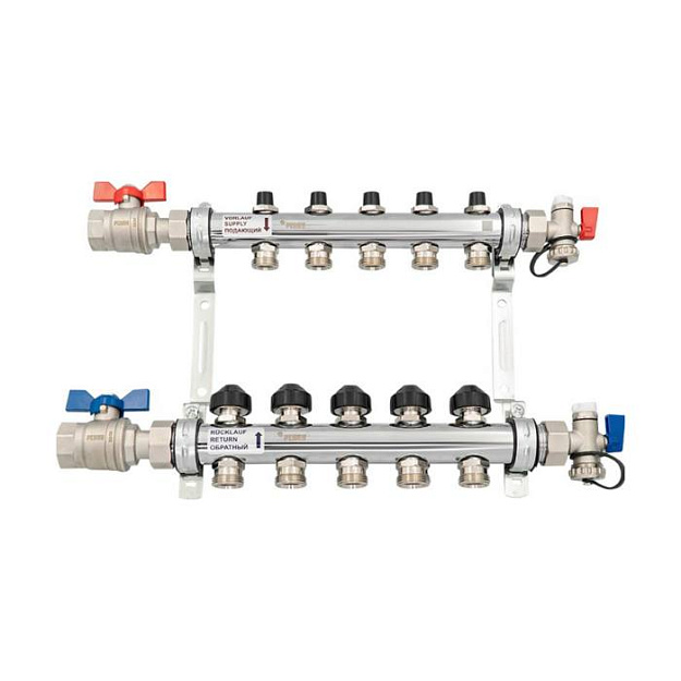 Коллекторные распределительные блоки с запорно-балансировочными и термостатическими клапанами предназначены преимущественно для распределения теплоносителя по контурам радиаторного отопления с целью обеспечения в помещениях заданных температур воздуха. Допустимо использование таких коллекторных групп и для напольного отопления, но мы рекомендуем для решения этой задачи использовать блоки с расходомерами вместо запорно-балансировочных клапанов.