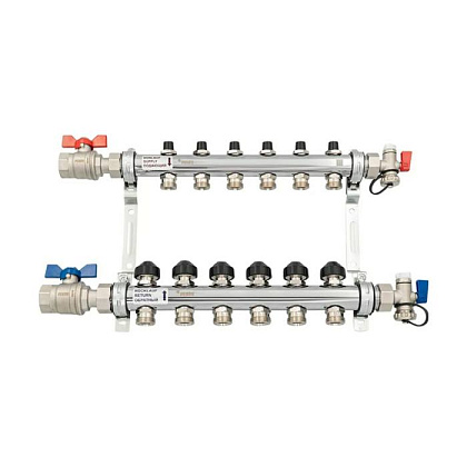Коллекторные распределительные блоки с запорно-балансировочными и термостатическими клапанами предназначены преимущественно для распределения теплоносителя по контурам радиаторного отопления с целью обеспечения в помещениях заданных температур воздуха. Допустимо использование таких коллекторных групп и для напольного отопления, но мы рекомендуем для решения этой задачи использовать блоки с расходомерами вместо запорно-балансировочных клапанов.