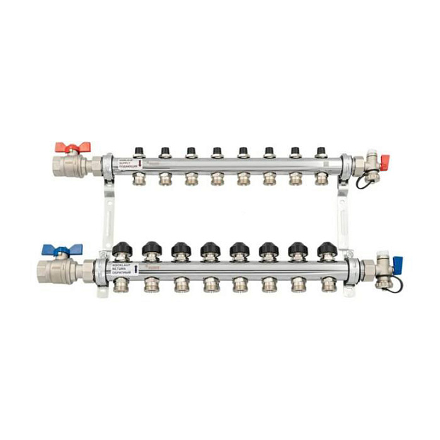 Коллекторные распределительные блоки с запорно-балансировочными и термостатическими клапанами предназначены преимущественно для распределения теплоносителя по контурам радиаторного отопления с целью обеспечения в помещениях заданных температур воздуха. Допустимо использование таких коллекторных групп и для напольного отопления, но мы рекомендуем для решения этой задачи использовать блоки с расходомерами вместо запорно-балансировочных клапанов.
