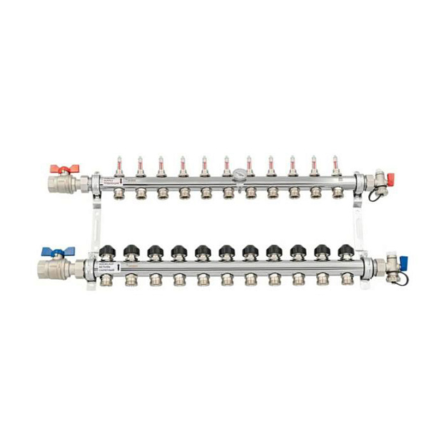 Коллекторные распределительные блоки с расходомерами и термостатическими клапанами предназначены для распределения теплоносителя по контурам напольного отопления с целью обеспечения в помещениях заданных температур воздуха.