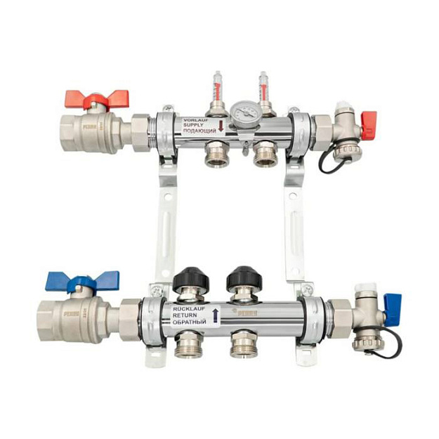 Коллекторные распределительные блоки с расходомерами и термостатическими клапанами предназначены для распределения теплоносителя по контурам напольного отопления с целью обеспечения в помещениях заданных температур воздуха.