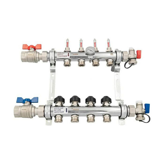 Коллекторные распределительные блоки с расходомерами и термостатическими клапанами предназначены для распределения теплоносителя по контурам напольного отопления с целью обеспечения в помещениях заданных температур воздуха.