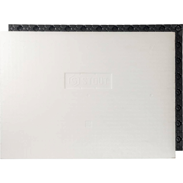 Теплоизоляционная плита с фиксирующими бобышками и тепло-звукоизоляционным нижним слоем из пенополистирола STOUT предназначена для укладки труб водяного отопления в полу. Прочное пленочное покрытие обеспечивает прочность бобышек, а также гидроизоляцию.