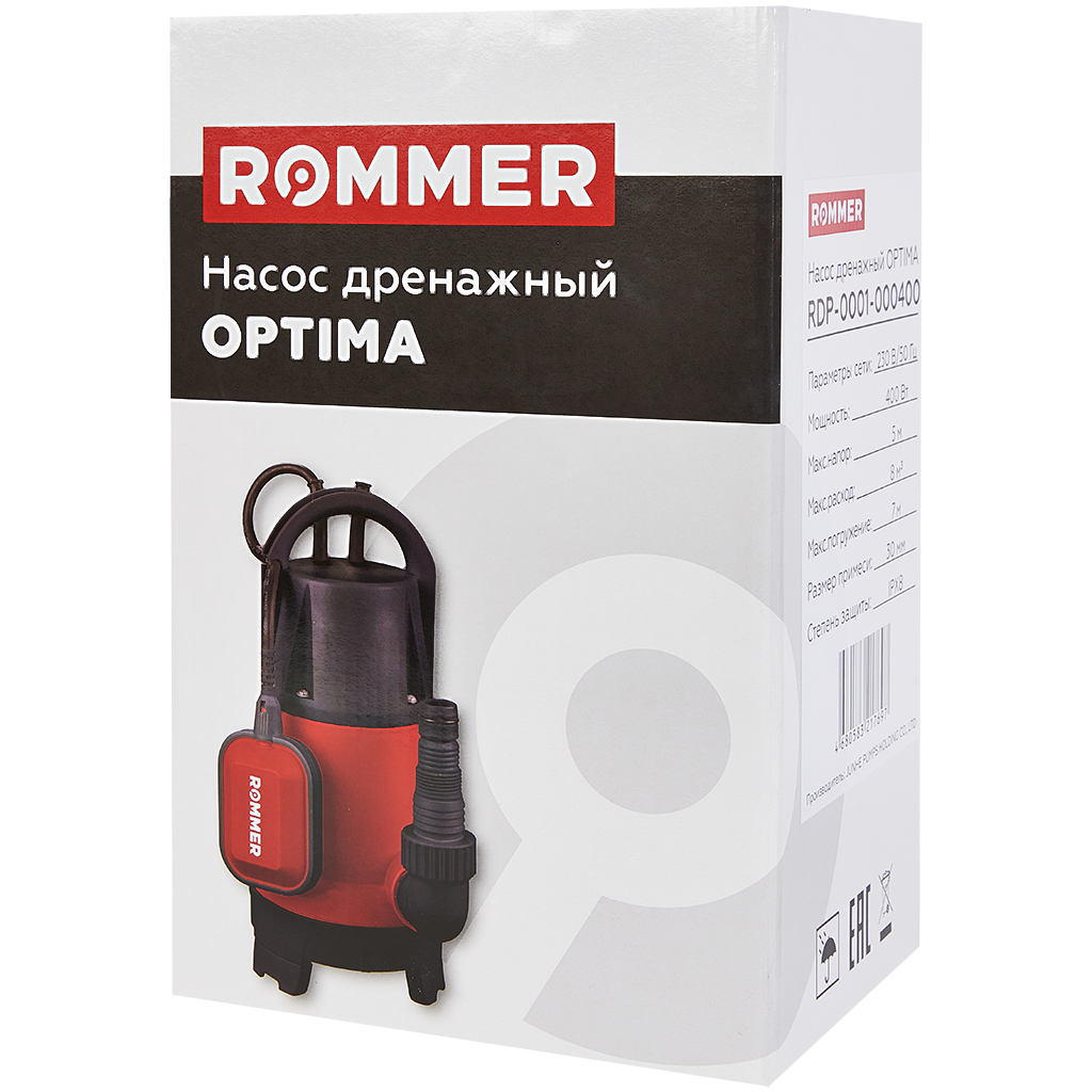 Дренажный насос ROMMER серии OPTIMA предназначен для осушения и дренажа. Основными сферами применения являются: откачивание воды из затапливаемых подвальных помещений (дренаж гаражей, автостоянок, тоннелей и т. д.), откачивание хозяйственно-бытовых стоков, откачивание воды из рек и прудов, откачивание воды, возникшей в результате аварийных и стихийных бедствий, аэрация прудов, циркуляция воды в искусственных водоемах, системы дренажа в сложных технических устройствах и сооружениях. Допустимый размер примесей 30 мм.