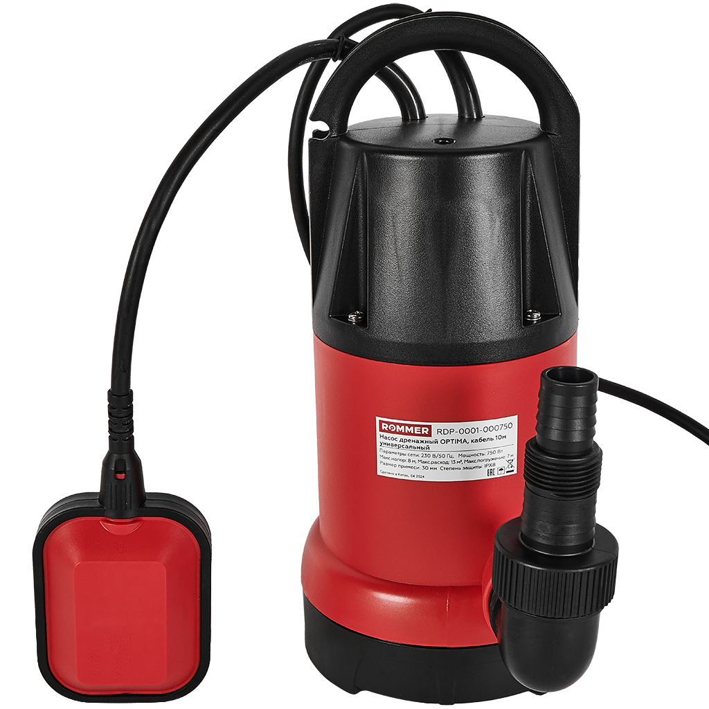 Дренажный насос ROMMER серии OPTIMA предназначен для осушения и дренажа. Основными сферами применения являются: откачивание воды из затапливаемых подвальных помещений (дренаж гаражей, автостоянок, тоннелей и т. д.), откачивание хозяйственно-бытовых стоков, откачивание воды из рек и прудов, откачивание воды, возникшей в результате аварийных и стихийных бедствий, аэрация прудов, циркуляция воды в искусственных водоемах, системы дренажа в сложных технических устройствах и сооружениях. Допустимый размер примесей 30 мм.
