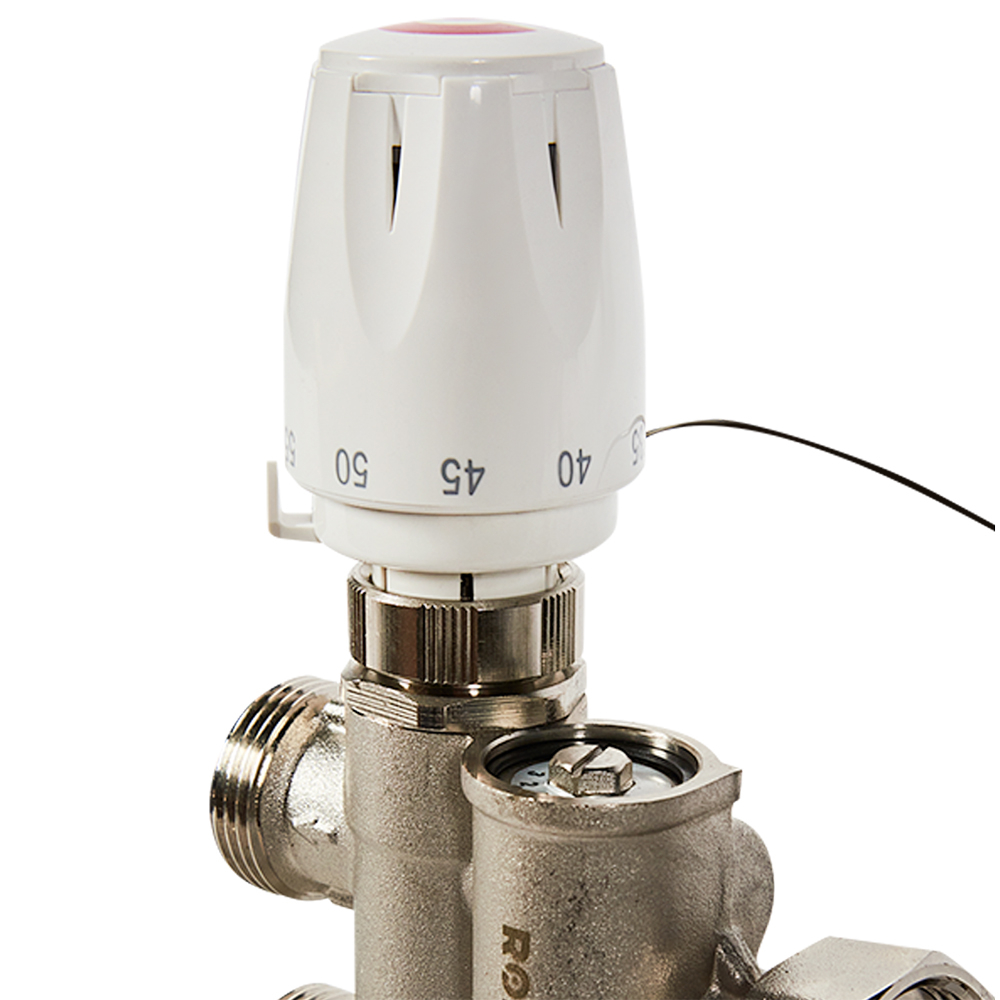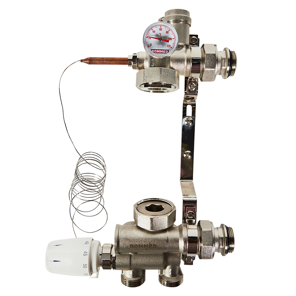Насосно-смесительный узел ROMMER с термоголовкой с выносным датчиком, без насоса предназначен для создания низкотемпературных систем отопления (типа «теплый пол»). Устанавливается непосредственно на коллекторной группе низкотемпературного контура и подключается к высокотемпературному контуру системы отопления. Комплектуется регулируемыми креплениями, автоматическим воздухоотводчиком, разъемными соединениями для подключения коллекторного блока, термометром, байпасной линией.