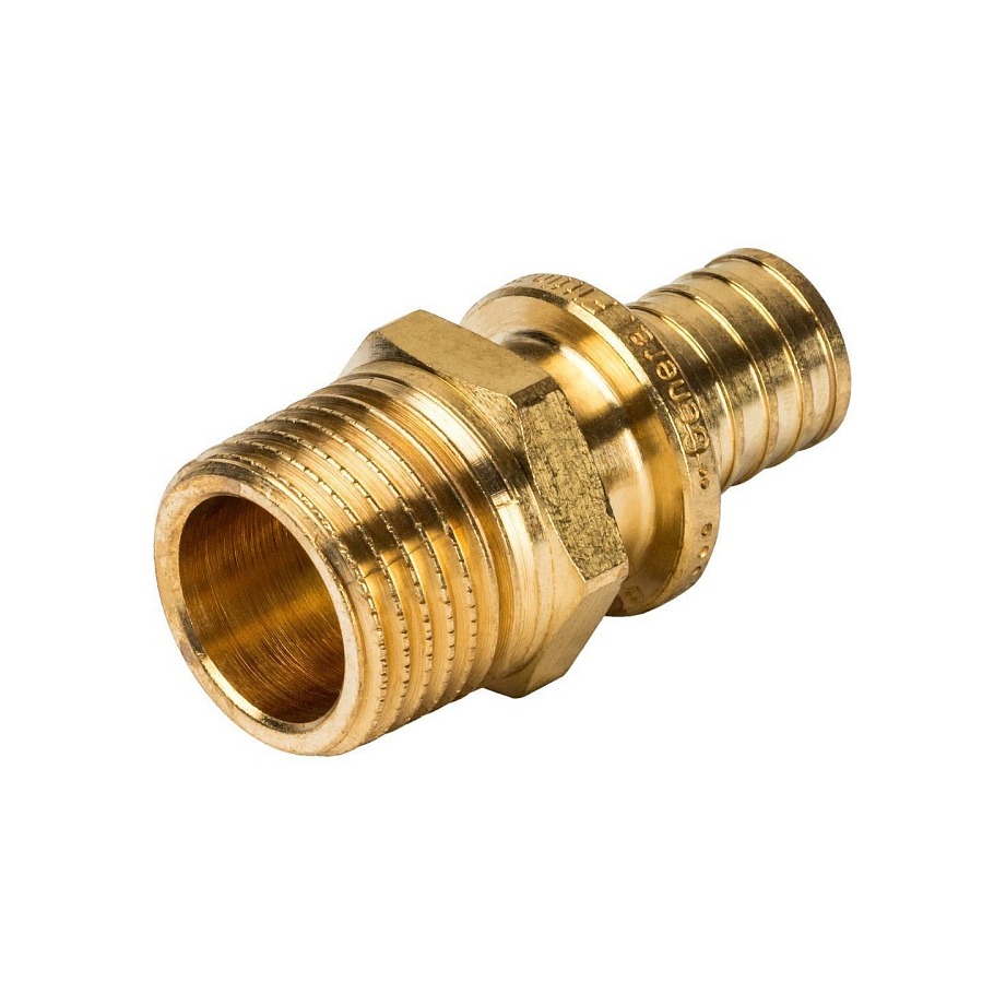 Переходник на наружную резьбу аксиального типа для трубы из сшитого полиэтилена. Для монтажа фитинга с трубой необходимо дополнительно приобрести 1 надвижную гильзу соответствующего диаметра.