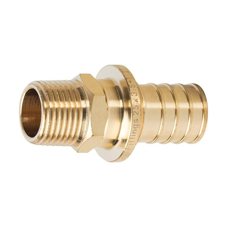 Переходник на наружную резьбу аксиального типа для трубы из сшитого полиэтилена. Для монтажа фитинга с трубой необходимо дополнительно приобрести 1 надвижную гильзу соответствующего диаметра.