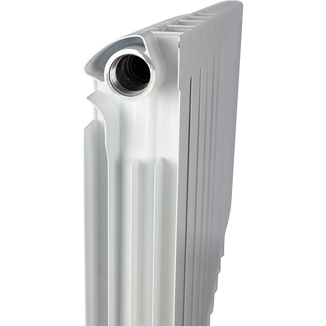 Каждая секция представляет собой единый монолит из двух коллекторов и связывающего их оребрения, внутри которого проходит вертикальный канал овального сечения. Особая форма оребрения и канала обеспечивают высокие теплотехнические показатели радиатора и низкое гидравлическое сопротивление
