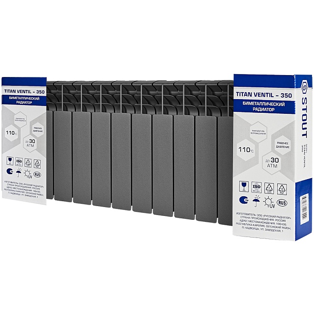 Радиатор биметаллический STOUT TITAN VENTIL 350 - 14 секций (подключение нижнее правое, цвет графит RAL 7024)