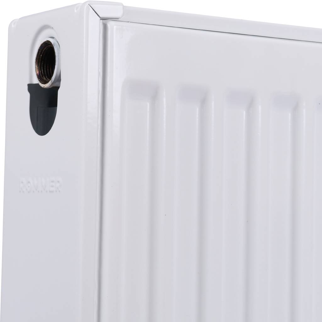 Стальной панельный радиатор ROMMER изготавливается из высококачественной холоднокатаной стали марки DC01. П-образное оребрение толщиной 0,4 мм приварено точечной сваркой непосредственно к вертикальным каналам, предназначенным для прохода теплоносителя. Подсоединения имеет внутреннюю резьбу 1/2". Радиатор покрыт белой эмалью (RAL 9016), отопительный прибор с таким покрытием не предназначен для установки в помещениях с излишне агрессивной или влажной средой (например: бассейны, автомойки, прачечные, химчистки). При этом его можно использовать в кухнях, ванных комнатах, туалетах в местах, находящихся вне зоны попадания водяных брызг.