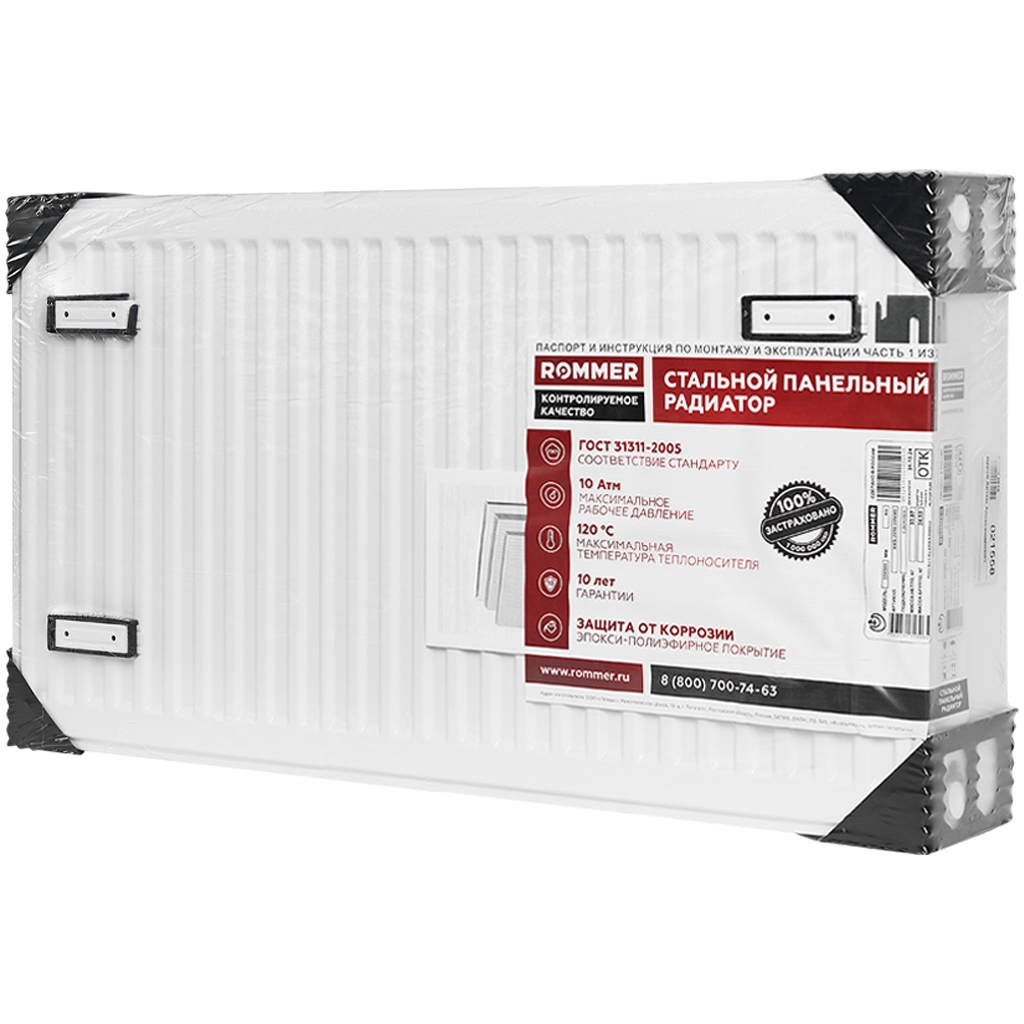 Стальной панельный радиатор ROMMER изготавливается из высококачественной холоднокатаной стали марки DC01. П-образное оребрение толщиной 0,4 мм приварено точечной сваркой непосредственно к вертикальным каналам, предназначенным для прохода теплоносителя. Подсоединения имеет внутреннюю резьбу 1/2". Радиатор покрыт белой эмалью (RAL 9016), отопительный прибор с таким покрытием не предназначен для установки в помещениях с излишне агрессивной или влажной средой (например: бассейны, автомойки, прачечные, химчистки). При этом его можно использовать в кухнях, ванных комнатах, туалетах в местах, находящихся вне зоны попадания водяных брызг.