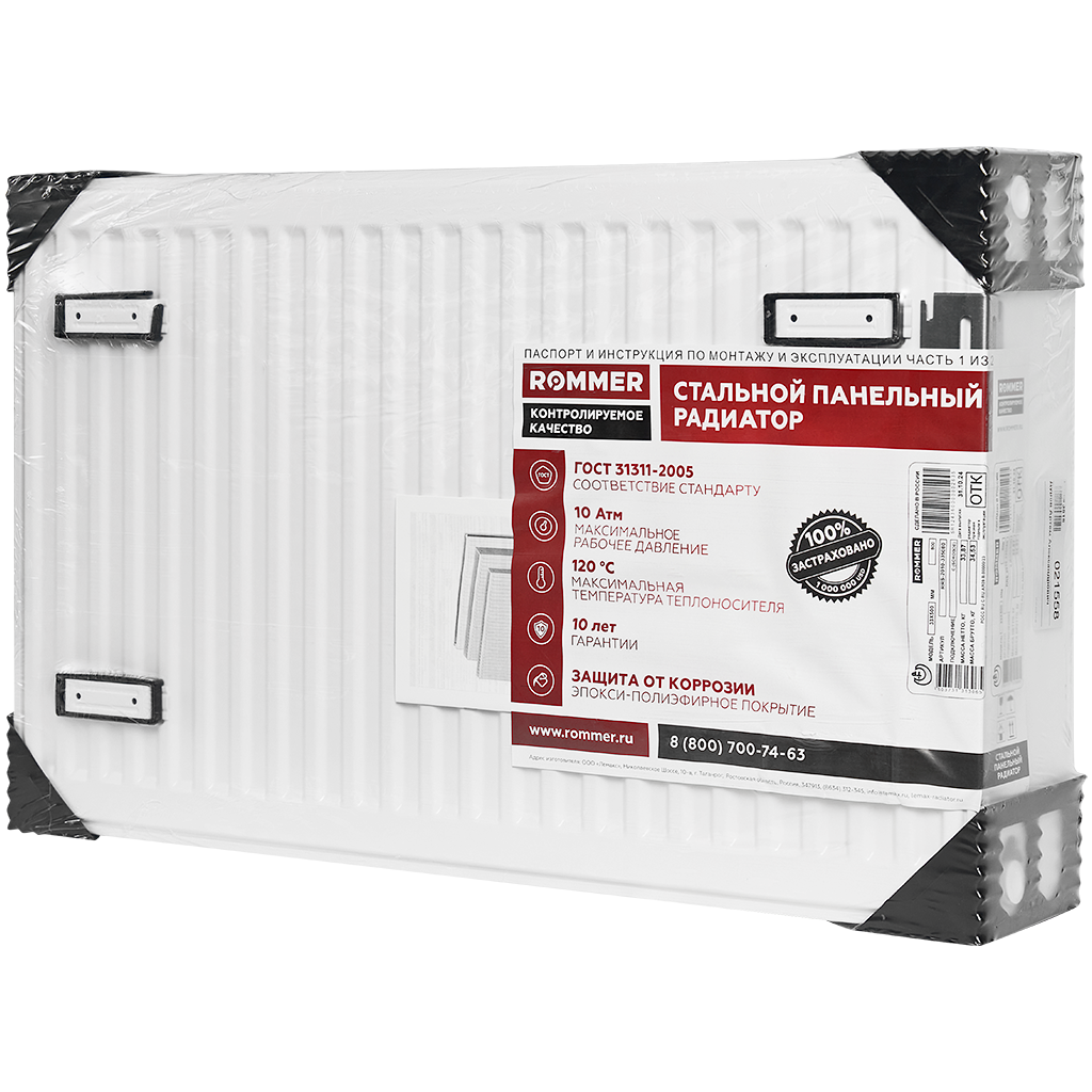 Стальной панельный радиатор ROMMER изготавливается из высококачественной холоднокатаной стали марки DC01. П-образное оребрение толщиной 0,4 мм приварено точечной сваркой непосредственно к вертикальным каналам, предназначенным для прохода теплоносителя. Подсоединения имеет внутреннюю резьбу 1/2". Радиатор покрыт белой эмалью (RAL 9016), отопительный прибор с таким покрытием не предназначен для установки в помещениях с излишне агрессивной или влажной средой (например: бассейны, автомойки, прачечные, химчистки). При этом его можно использовать в кухнях, ванных комнатах, туалетах в местах, находящихся вне зоны попадания водяных брызг.