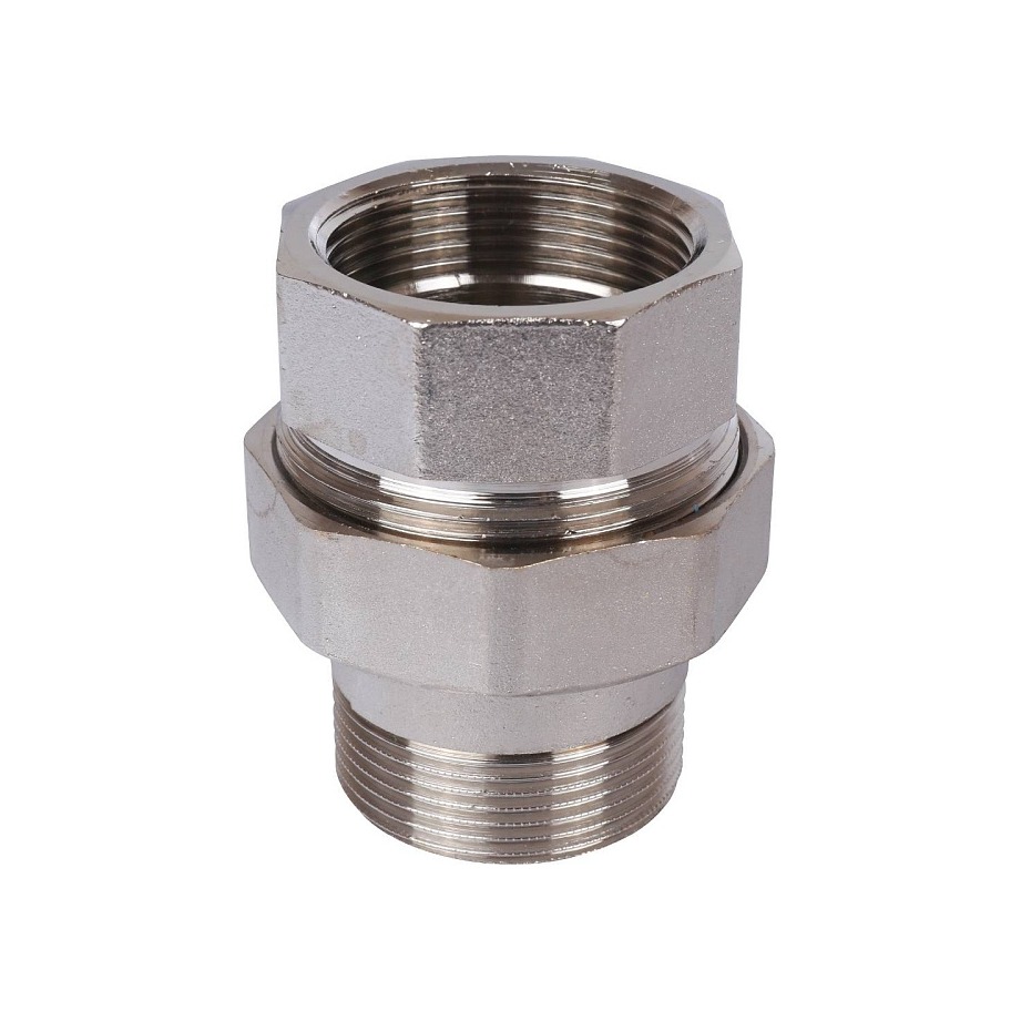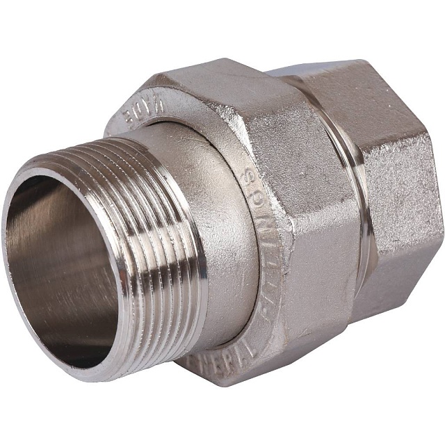 Разъемное соединение типа «американка» с внутренней/наружной резьбой, уплотнение под гайкой по плоскости.