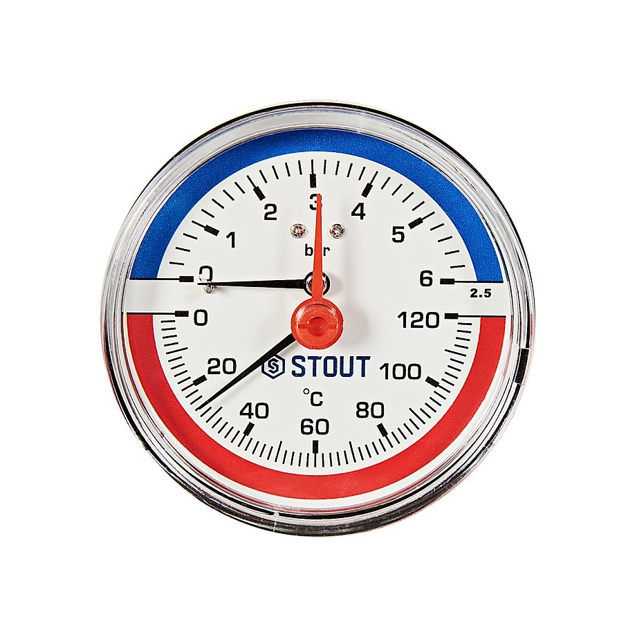 Термоманометр аксиальный STOUT - 1/2" (D80 мм, шкала 0-120°C/0-10 бар с запорным клапаном)