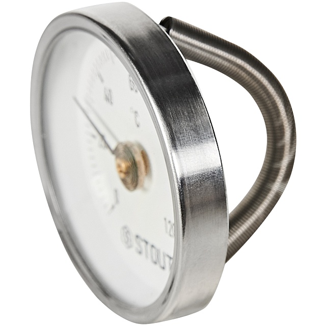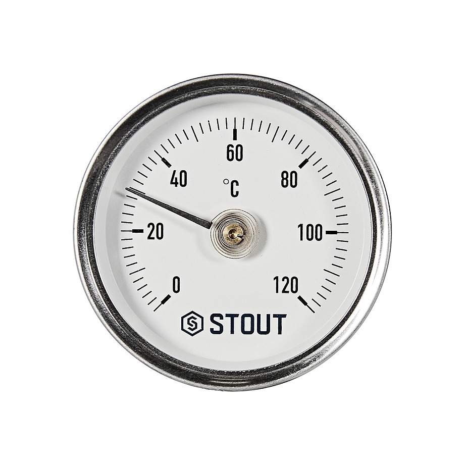 Термометр биметаллический с пружиной, для крепления на трубе диаметром от 30 до 65 мм, используется для определения температуры газообразных и жидких сред, которые работают в отопительных установках, системах кондиционирования и вентиляции.