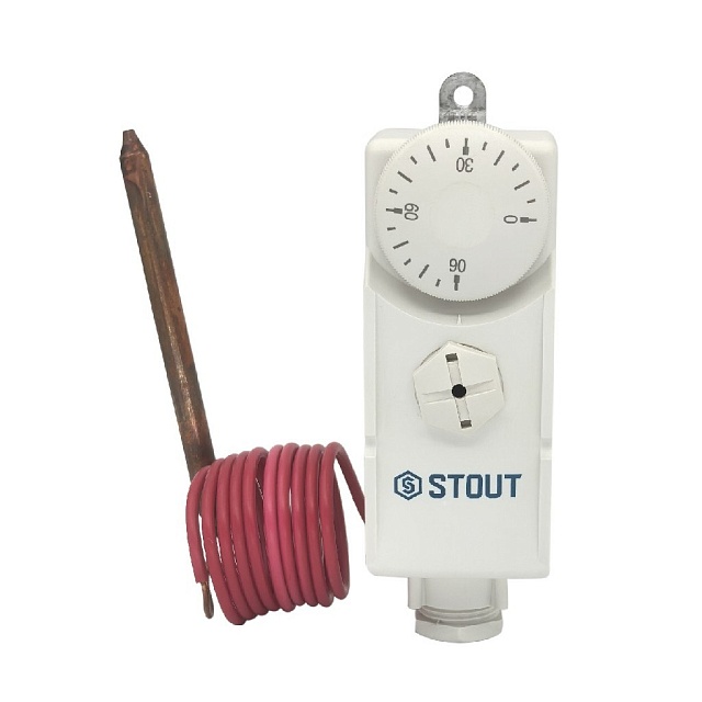 Термостат с выносным датчиком механический STOUT тип SТЕ-1007-100090 предназначен для контроля температуры теплоносителя в системах отопления. Он устанавливается на поверхность сверху (есть петли для крепления) и производит автоматическое поддержание заданных значений температуры путем включения и выключения оборудования (насосов, горелок, электротермических приводов и т.д.).